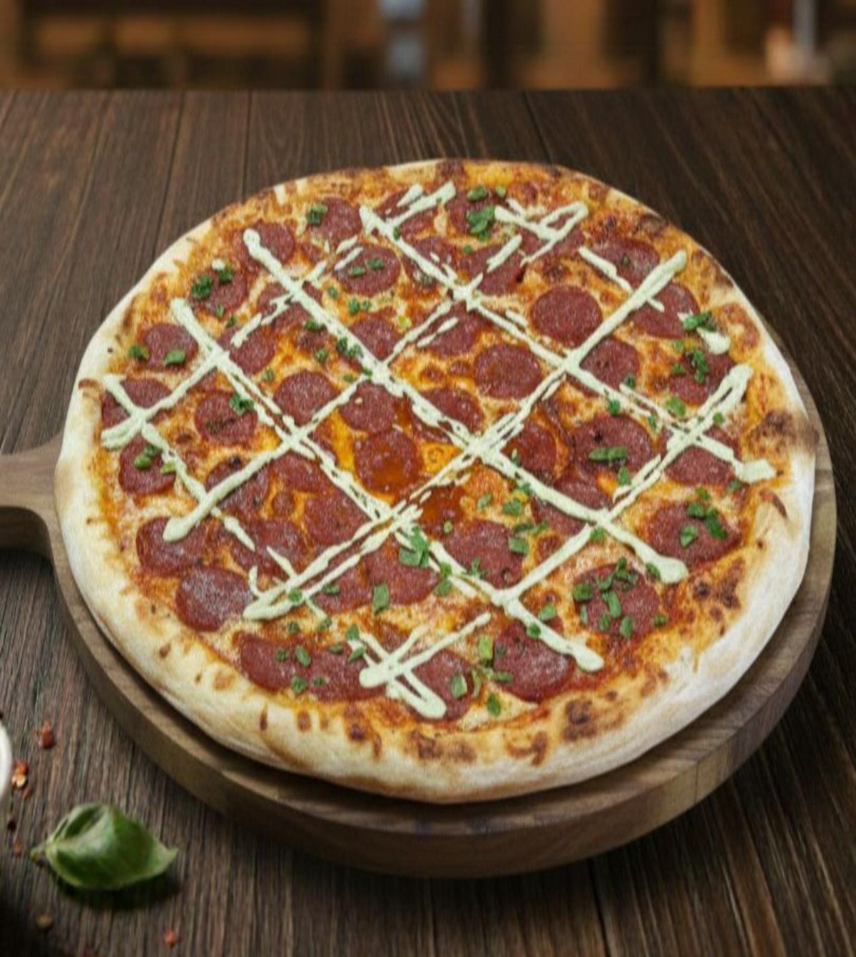 Blat, sos de pizza, mozzarella, pepperoni, pesto cream - 1560g