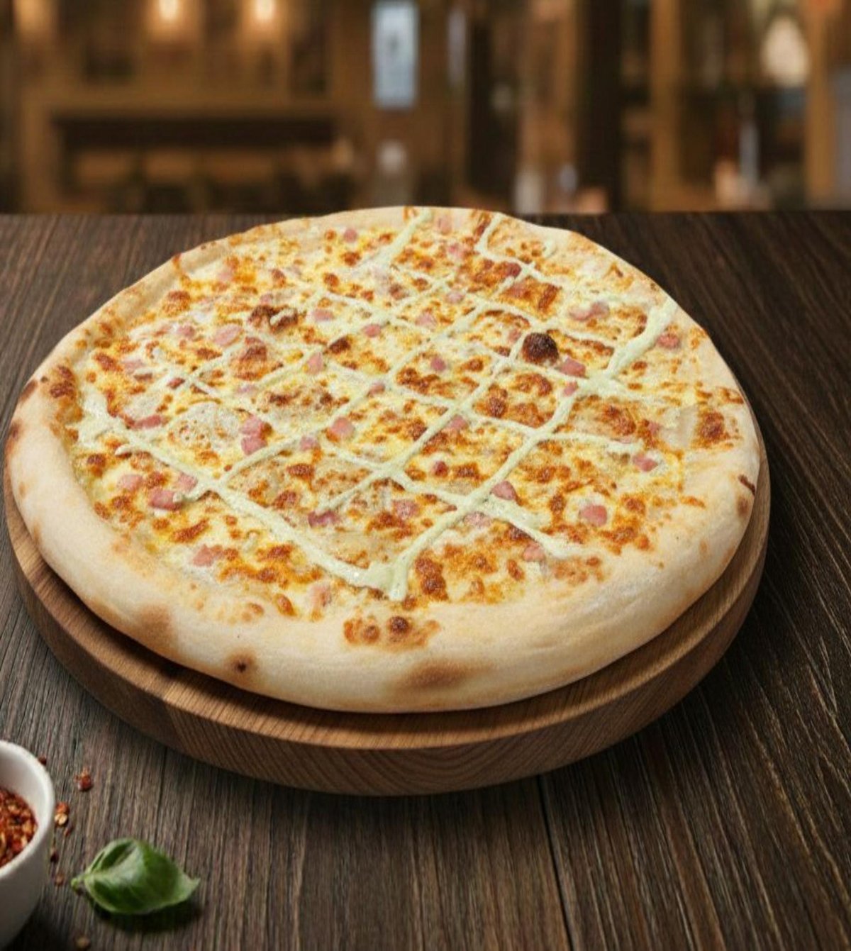 Blat, mozzarella, sos de pizza, smantana, bacon crocant, pesto cream