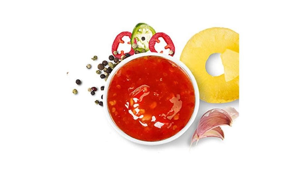 Apa, zahar, sirop de glucoza, otet alimentar, ananas din compot, ardei rosu deshidratat, amidon modificat din porumb, sare iodate, emulsie de boia, pudra de usturoi, arome, acidifiant: acid citric, antioxidant: acid ascorbic, condimente naturale, conservanti: benzoat sodiu, sorbat de potasiu, stabilizatori: guma guar, guma xanthan, pudra de chilli ° Alergenii sunt evidentiati cu majuscule