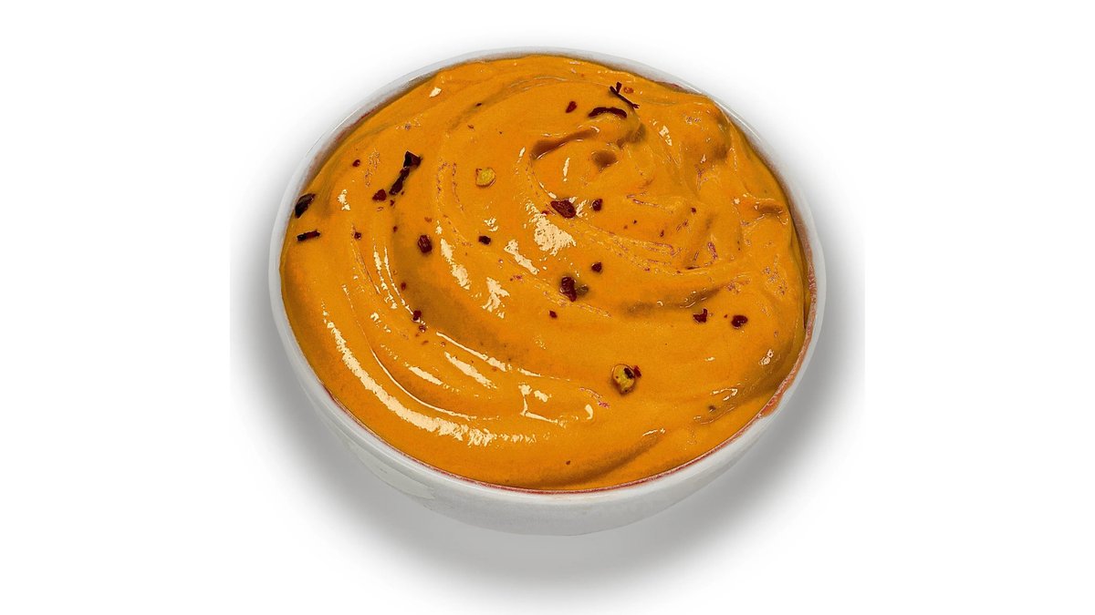 Mouhammara (sos iute chillisriracha, pastă de ardei dulce, ulei floarea soarelui, miez de nucă, usturoi pastă, pesmet, pastă tomate, ulei măsline, cumin), cu decor de migdale aşchii - 140g