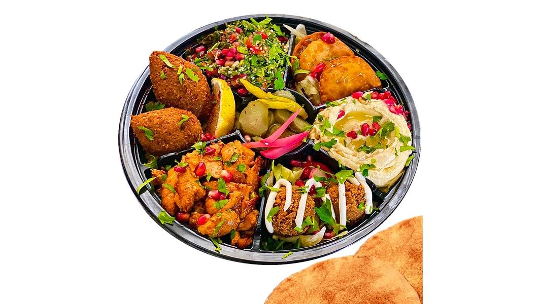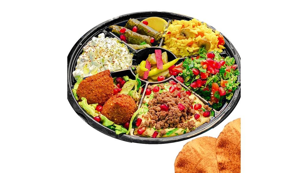 Mega hot Mix Mezze {Ras as four pui preparat (fasii carne pui preparate cu ceapa, pasta usturoi, dressing rodie cu lamaie), saorma de pui, hummus clasic, hummus avocado, conopida prajita, carne de vita tocata, crispy pui, falafel prajit 2 buc, salata libaneza, sos pasta de susan, castraveti murati, dressing rodie cu lamaie, ardei iute murat, rodie boabe, patrunjel verde tocat, ulei masline extravirgin} – 580g + 2 lipii (140g)