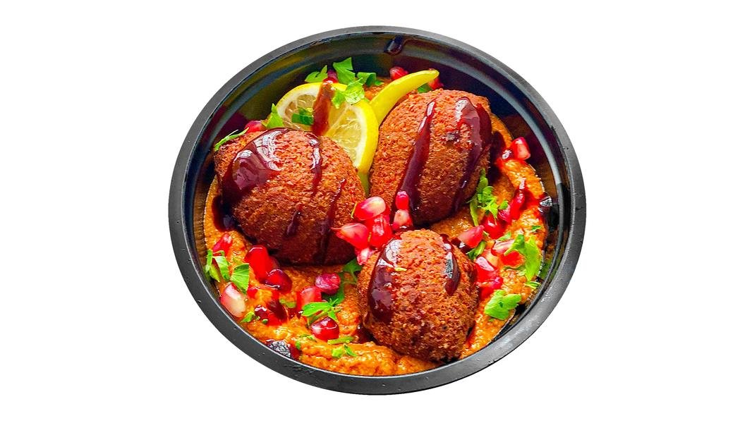 Mezze kibbeh VITA prajite (3buc), muhammara (pasta de ardei cu NUCI, ulei masline extravirgin, condimente), rodie boabe, sumac, lamaie felie, patrunjel verde 200g