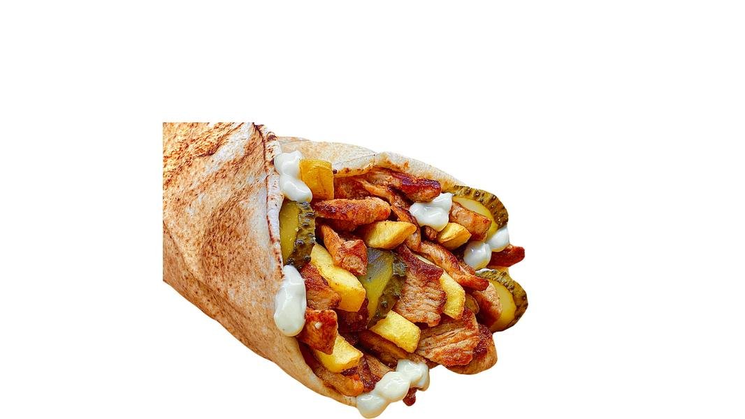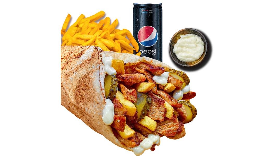 Shaorma pui, cartofi prăjiți, castraveţi murati, pastă de usturoi Spring, lipie libaneza - 210 g / 80 g