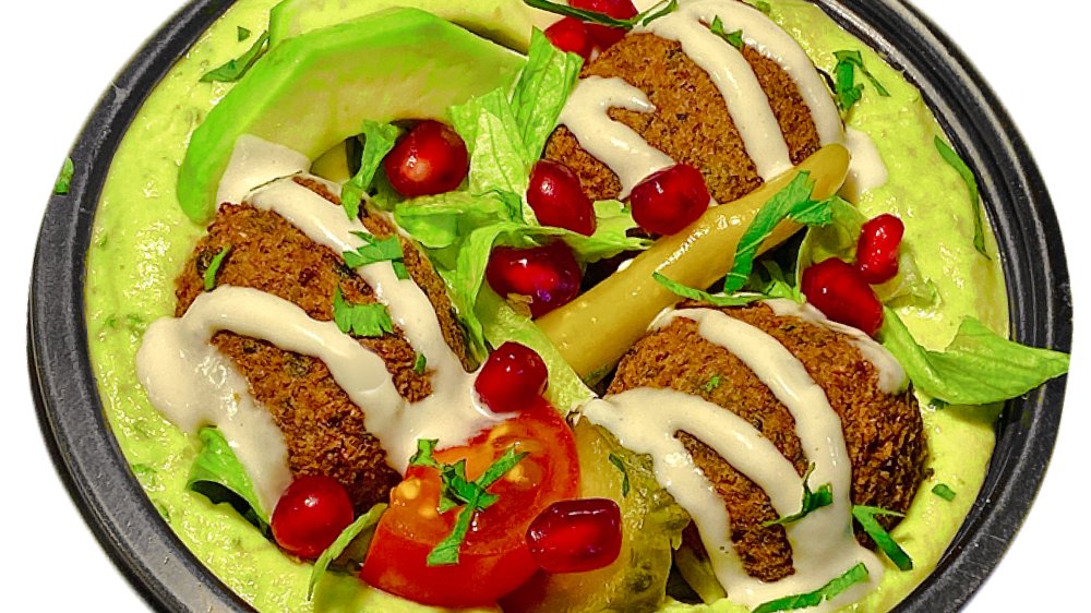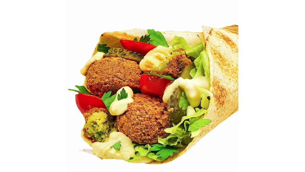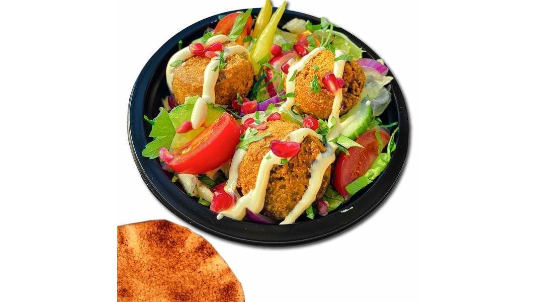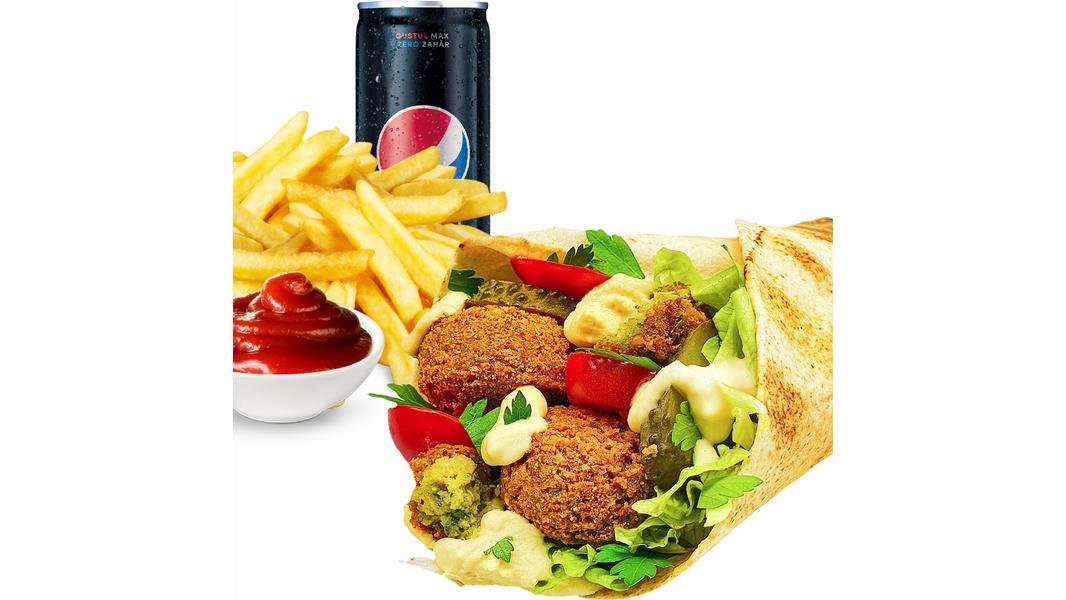 Falafel prajit (chiftelute vegetale din naut), sos pasta de susan, castraveți murati, roșii, ceapa, patrunjel, lipie libaneza - 380g