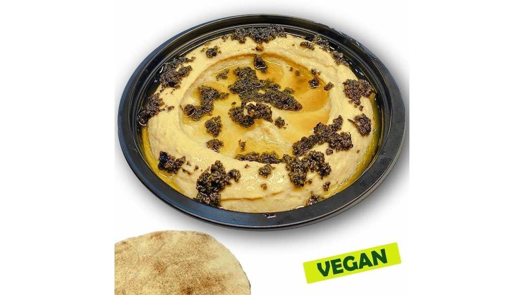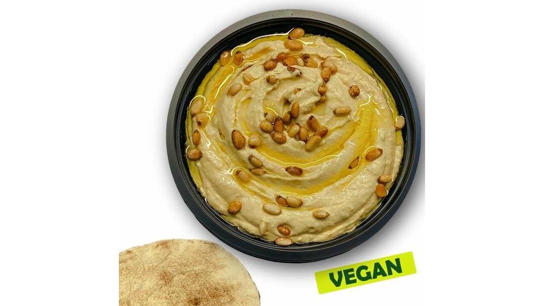 Hummus (naut, pasta de susan, apa, ulei floarea soarelui, sare iodata, acidifiant: acid citric), cu décor de rodie boabe, ulei de masline extravirgin, patrunjel verde + 1 lipie - 50g