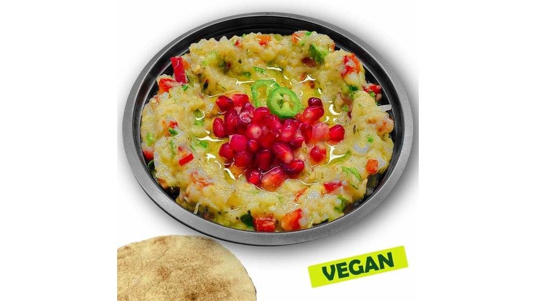 Baba Ganoush – salata de vinete cu legume [vinete coapte tocate, ceapa, ardei gras capia, pasta usturoi, patrunjel verde, ulei masline, ulei floarea soarelui, sare iodata, acidifiant: acid citric, ardei iute verde], cu décor de rodie boabe, patrunjel verde, ardei iute verde, ulei masline extravirgin – 140g + 1 lipie (50g)