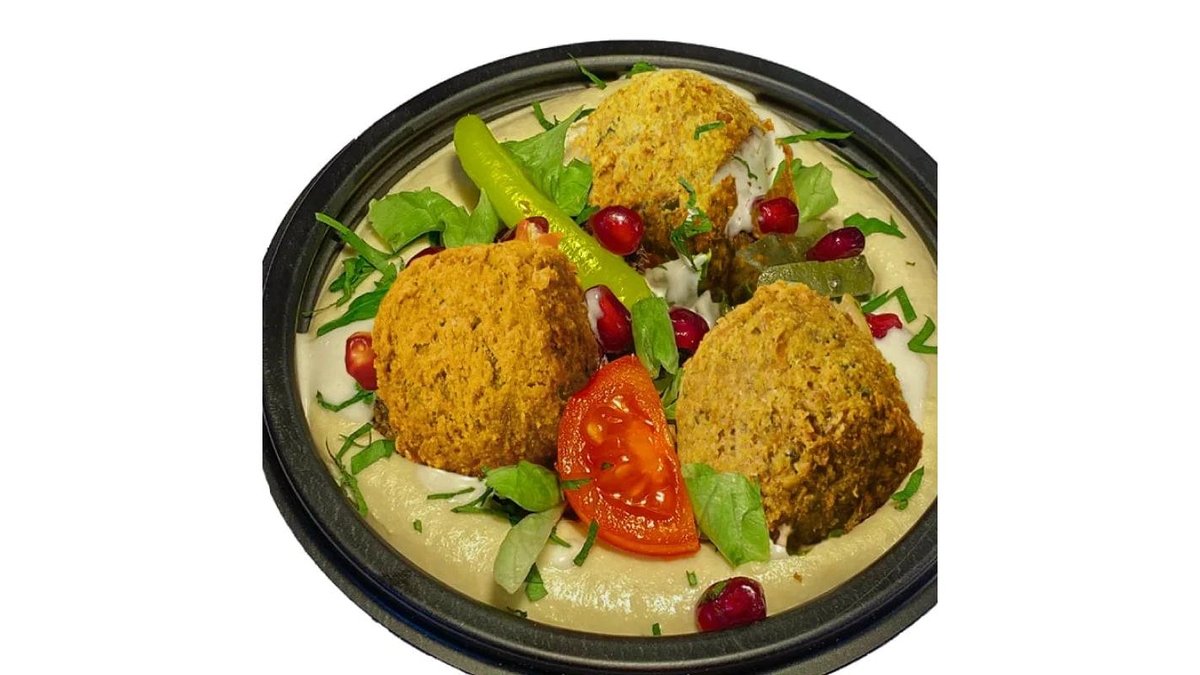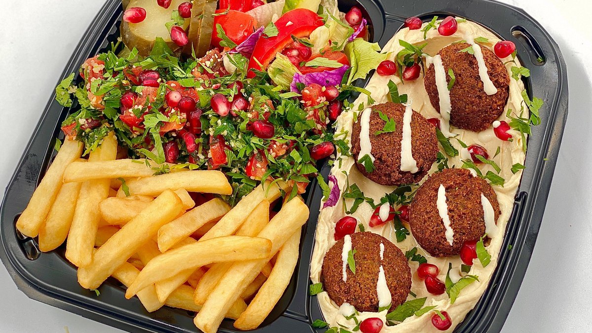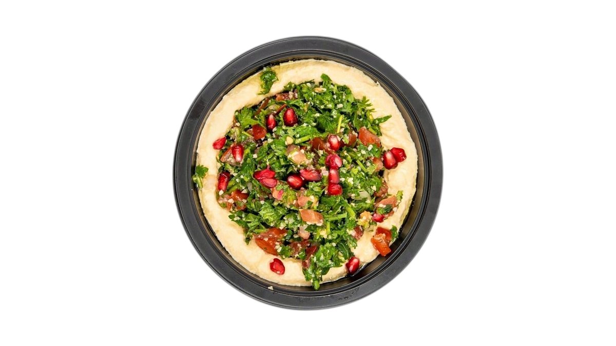 Humus vita {humus clasic, salata tabouleh (roșii, pătrunjel verde, GRAU fin, ceapă, lamaie zeama, ulei măsline extravirgin, sare iodata), carne de vita tocata, cartofi prajiti, falafel prajit 2 buc, salata libaneza (roșii, castraveți verzi, salată iceberg, ardei gras roșu capia, ceapă, ridichi), avocado felie, sos pasta de susan, ardei iute murat, rodie boabe, ulei masline extravirgin, patrunjel verde} – 400g / 40g + 1 lipie (70g)