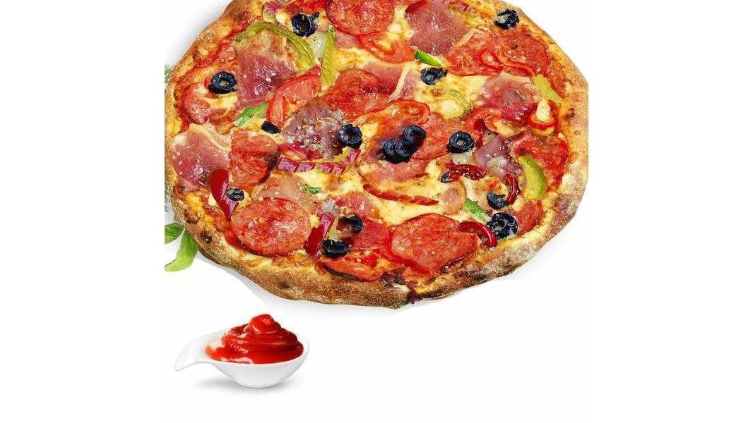 Pizza Regina {aluat classic pizza, MOZZARELLA, sos pizza, sunca (porc), salam peperoni crud uscat (carne porc), ciuperci champignon, masline negre rondele, ardei gras capia, oregano} – 300g / 40g + 1 Ketchup dulce - 40 g