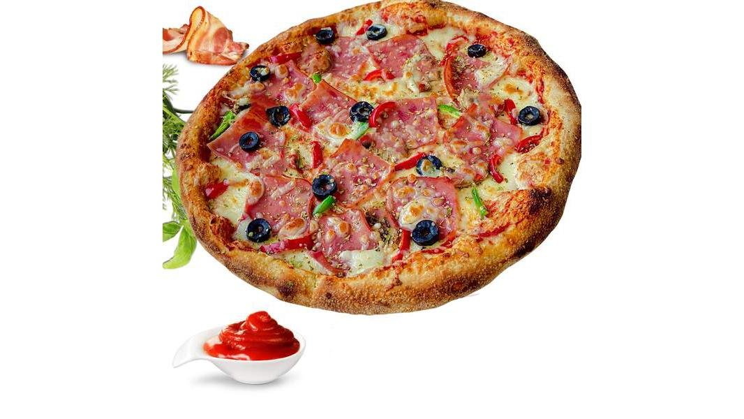Blat pizza, mozzarella, felii de suncă (came porc), sos pizza, ciuperci champignon, măsline negre rondele, ardei gras / capia, caşcaval, condimente - 340g / 40g + ketchup 30g