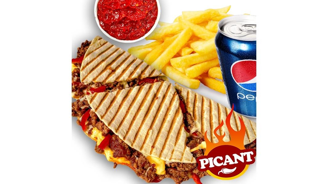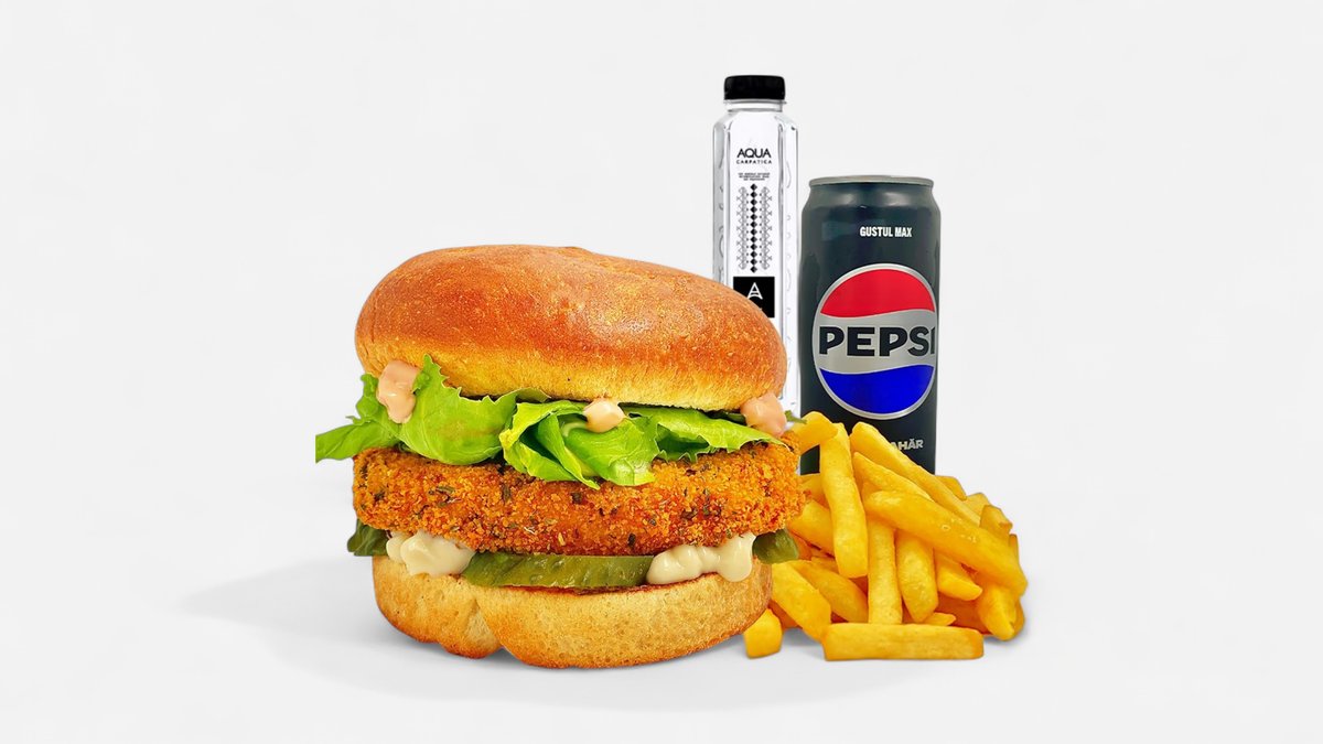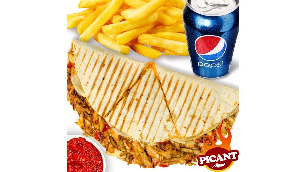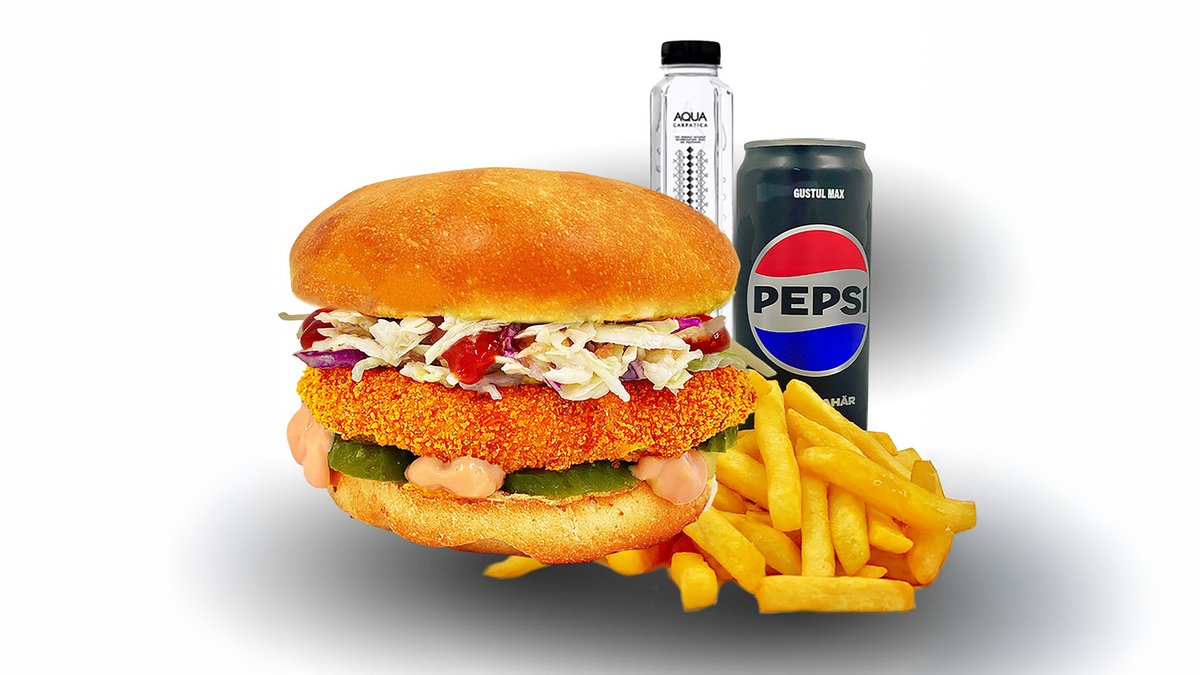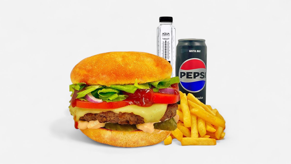 Sandwich (260g / 90g) + portie cartofi (130g) + sos la alegere * (30g) + bautura din gama pepsi la doza 330ml sau apa minerala / plata sticla 500ml