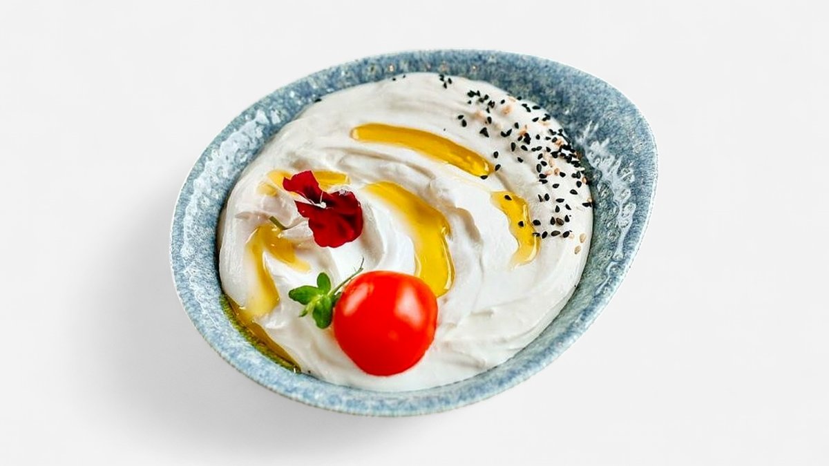 Labneh Crema de iaurt, rosie, castravete verde, masline kalamata, ulei masline extravirgin, menta uscata – 140g + 1 lipie (50g)
