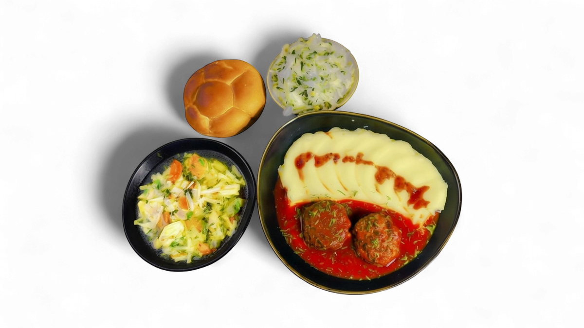 Ciorbă de legume 300 g Sau Supă de pui cu tăiței 300g/35g+ Parjoale de porc(2 buc – 120g) + Orez cu legume (200g) + Salată de varză (130g) + Chiflă (1 buc - 50g)