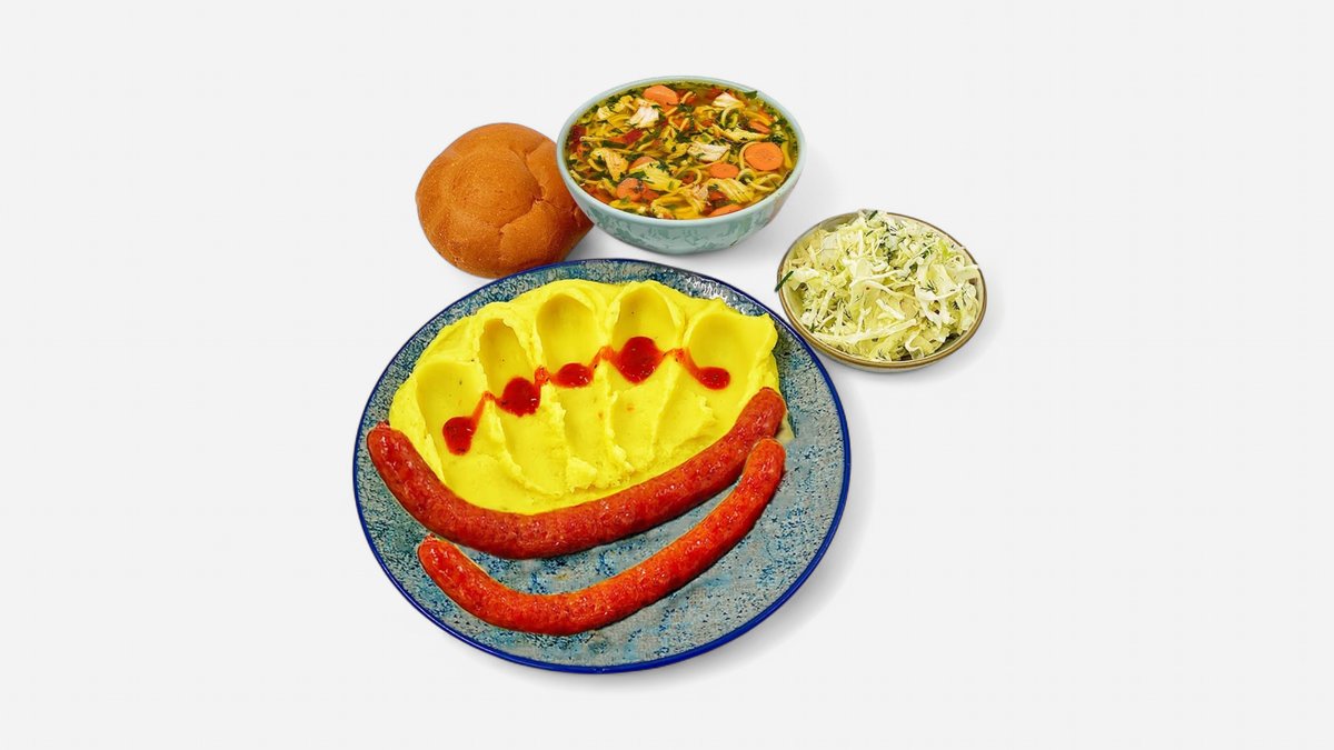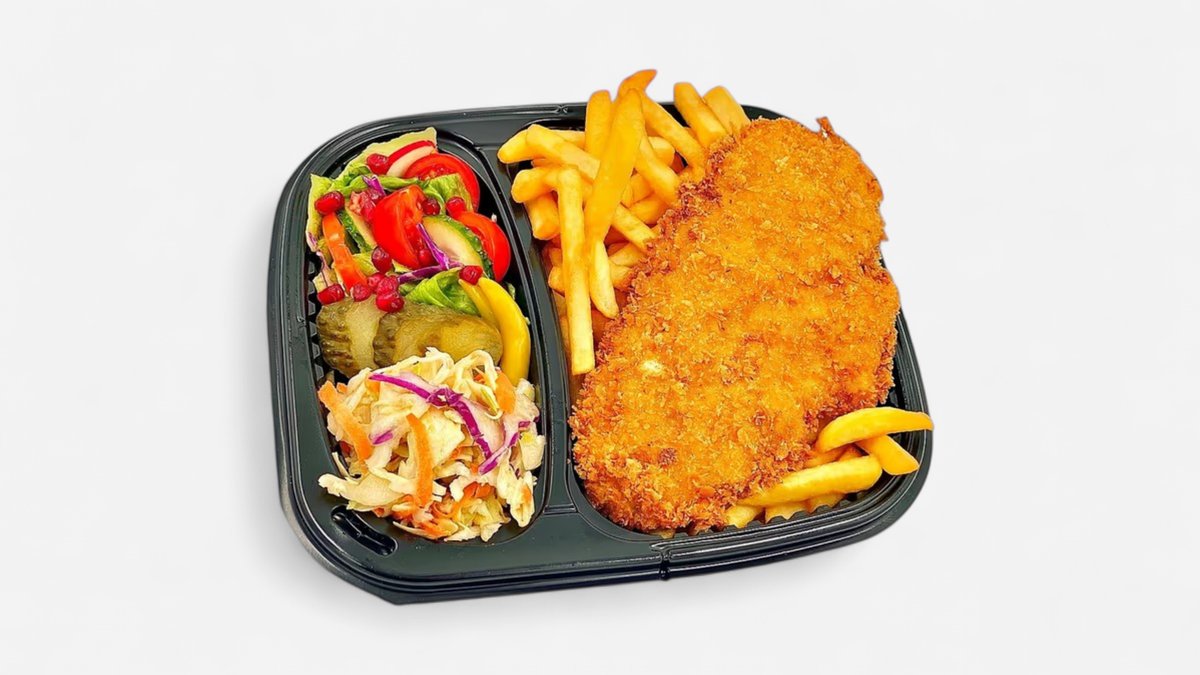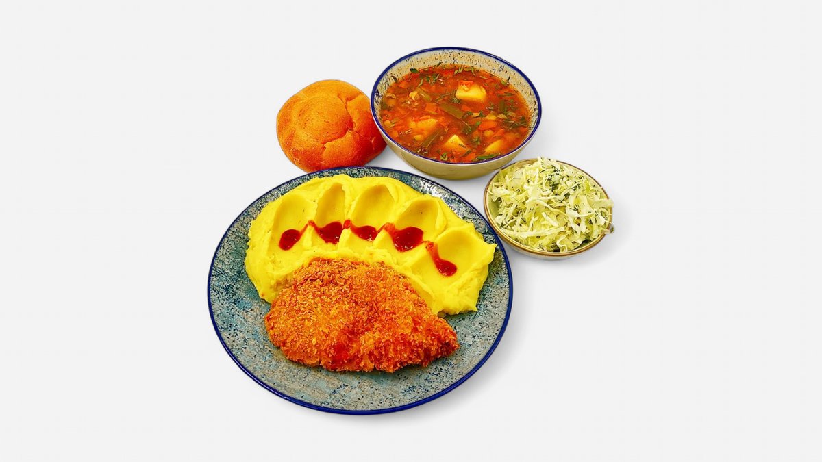 Ciorbă de legume 300 g Sau Supă de pui cu tăiței 300g/35g+ Panko șnițel pui (1 buc - 120g)+ Piure cartofi (fulgi carto) 250g + Salată de varză (130g) + Chiflă (1 buc - 50g)