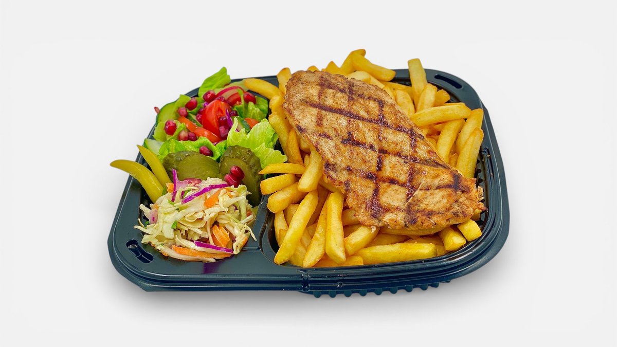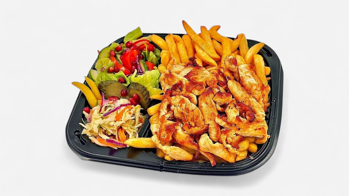 Saorma pui Mix Mezze {Fasii file piept de pui marinat grill, Hummus clasic, Salata tabbouleh, Salata libaneza, Falafel prajit 2 buc, Cartofi prajiti, Castraveti murati, dressing rodie cu lamaie si décor de rodie boabe si patrunjel verde si ulei masline extravirgin} - 460g / 100g + 1 lipie - 70g