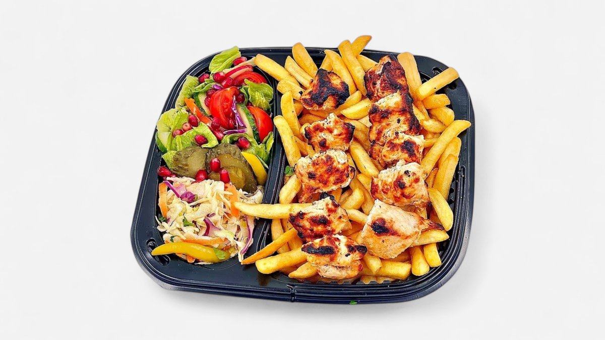 Frigarui de pui cu legume si Orez {Orez cu fidea prajita, Frigarui din piept de pui cu legume (ardei gras capia, ceapa, ciuperci) – 140g, Salata libaneza (rosii, castraveti verzi, salata iceberg & romana, varza alba & rosie, ardei gras capia, ridichi, rodie boabe, ceapa rosie), Mix legume la gratar (rosii, ceapa, ardei iute), Castraveti acri, Sos rodie si Ardei iute murat} – 420g/140g + 1 sos la alegere din gama prezenta in stoc si la vanzare + 1 lipie (70g)