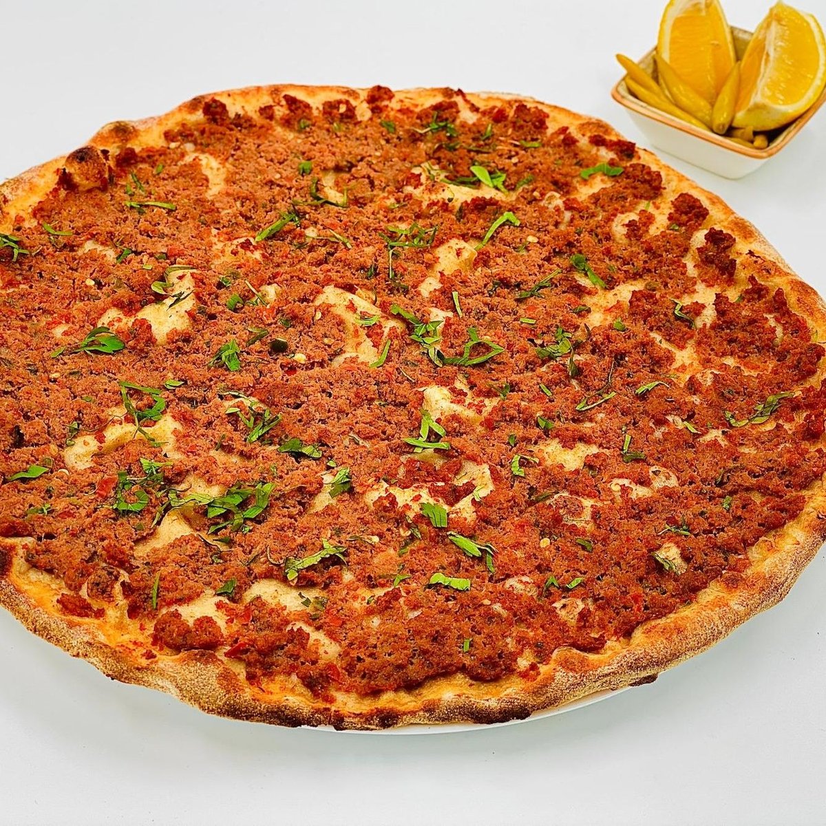 Lahmajun {aluat , amestec lahmajun preparat (carne de vita, legume tocate si condimente), asezonat cu lamaie si ardei iute murat}