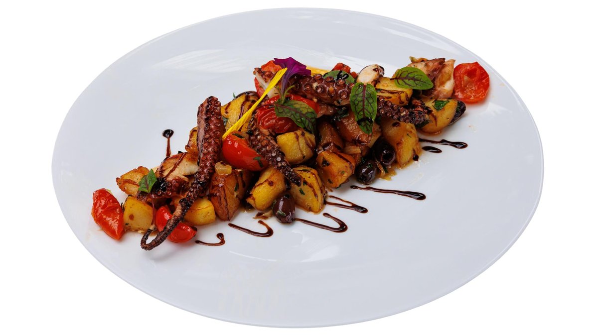 Tentacule de caracatiță, cartofi, ceapă, măsline, roșii cherry, busuioc, 450g