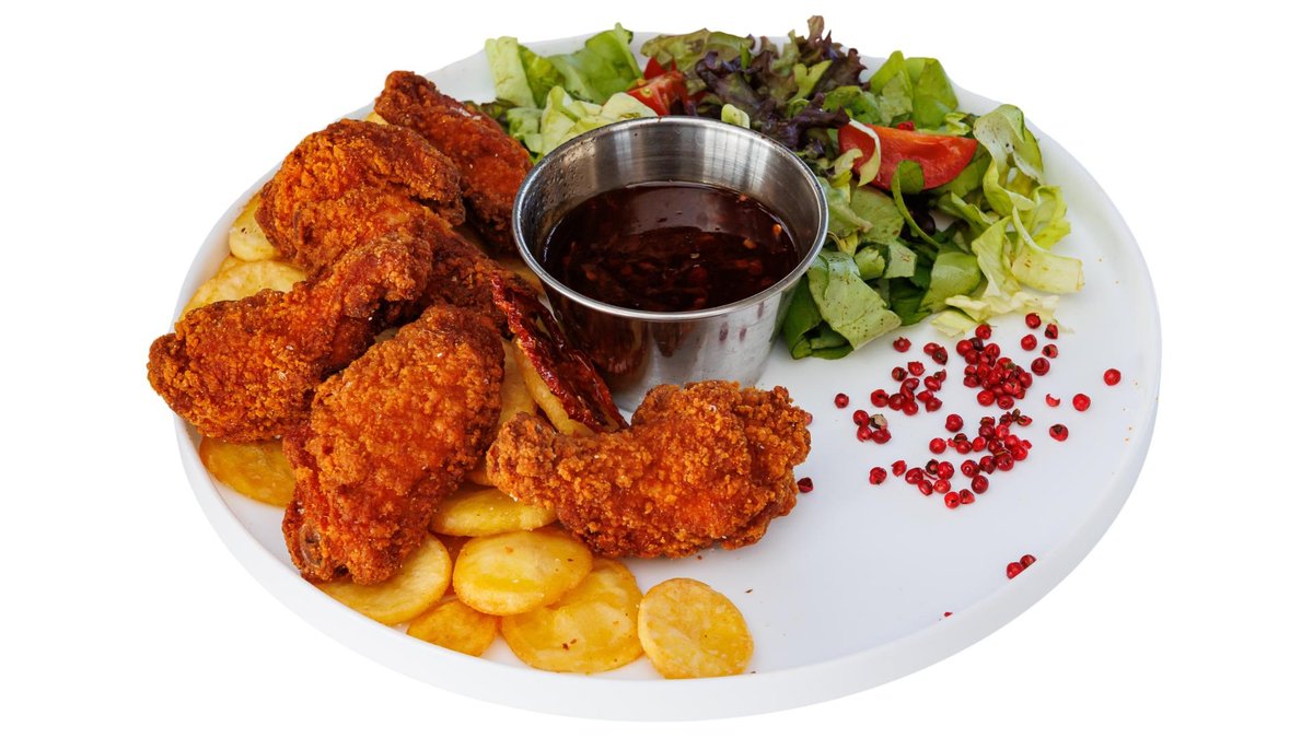 Aripioare în crustă de fulgi de porumb, cartofi rondele, sos picant, salată, 550g
