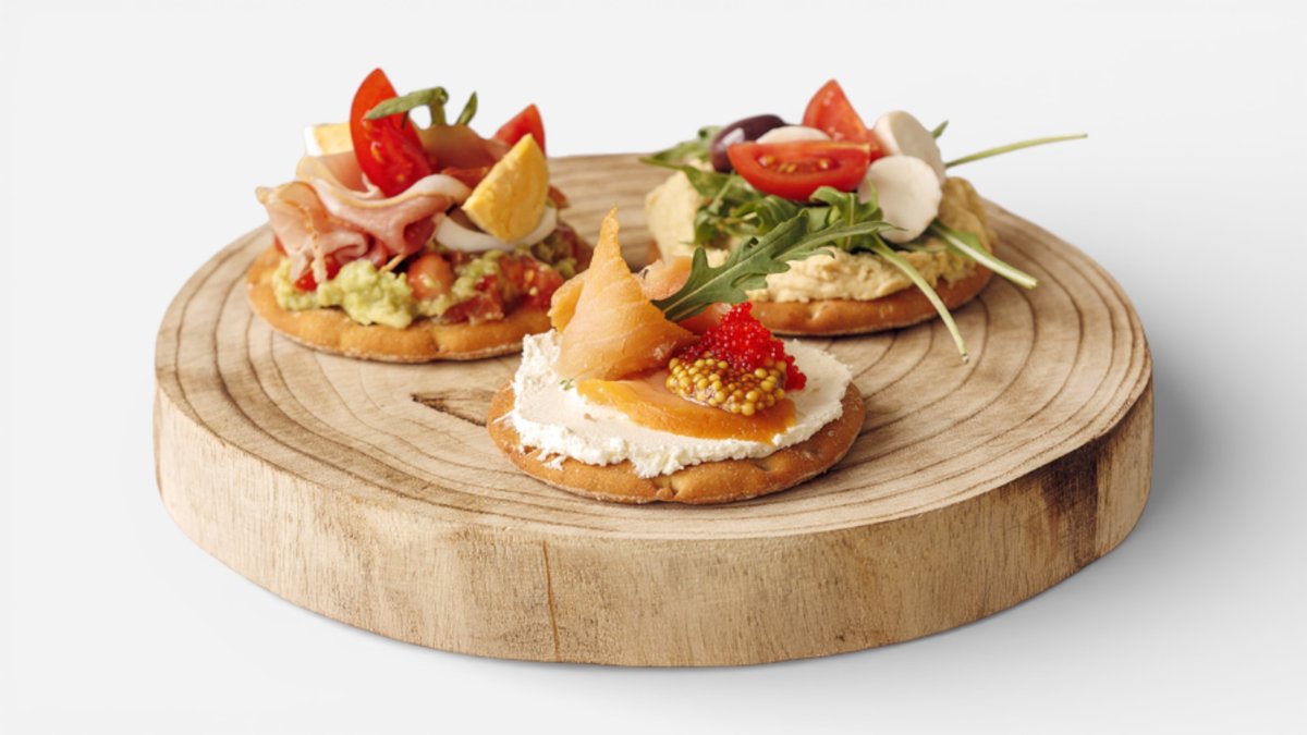 Pita, hummus, guacamole, cremă de brânză, somon fume, roșii cherry, speck, ou fiert, mozzarella, măsline, somon Dijon, 200g