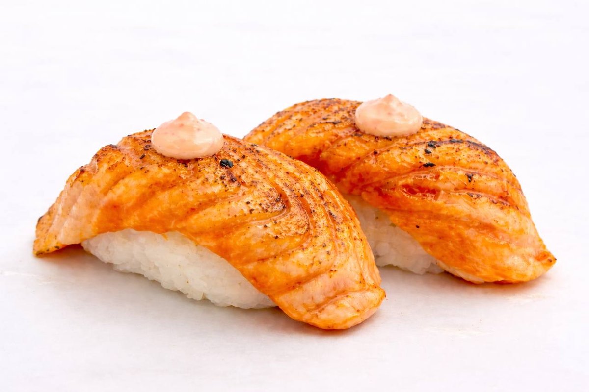 orez pentru sushi 0,05, somon tataki 0,05, spicy mayo 0,005 Valori nutriționale per 100 g Calorii: 197 kcal Energie: 824 kJ Proteine: 11 g Grăsimi: 9,2 g Carbohidrați: 16,8 g Alergeni pește