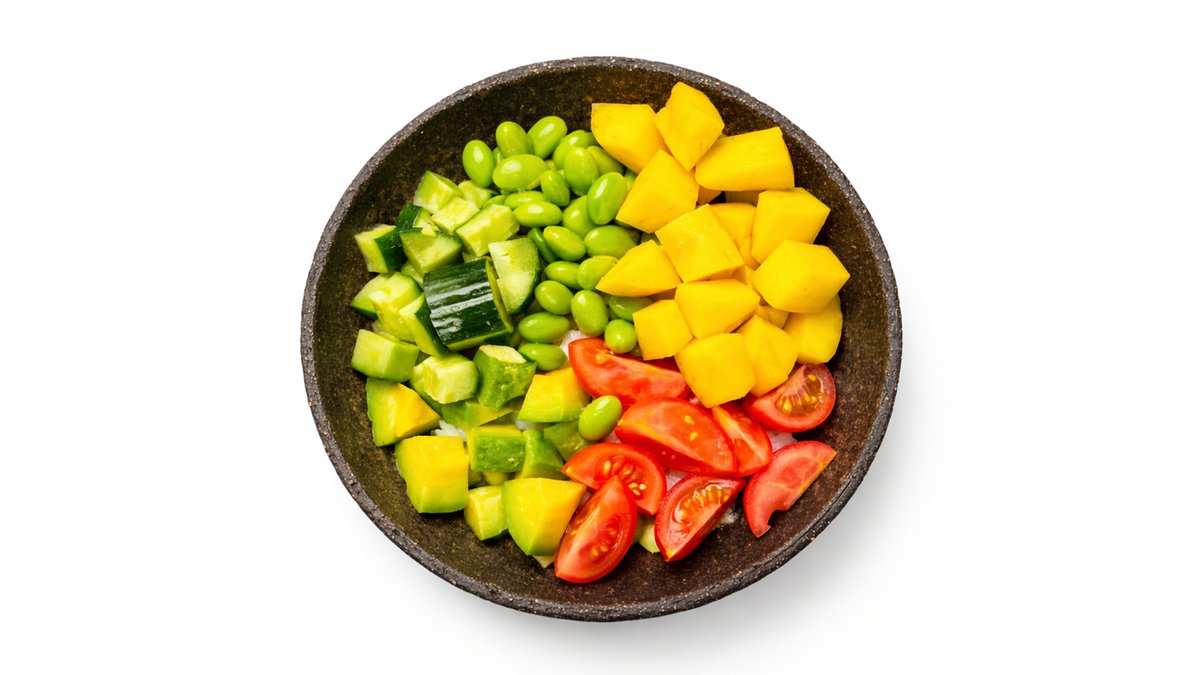orez pentru sushi 0,2, avocado 0,03, roșii cherry 0,03, castraveți 0,03, edamame 0,03, ridiche 0,015, mango 0,06, sos yuzu ponzu 0,03 Valori nutriționale per 100 g Calorii: 155 kcal Energie: 649 kJ Proteine: 4,1 g Grăsimi: 3,2 g Carbohidrați: 27,8 g Alergeni soia, gluten