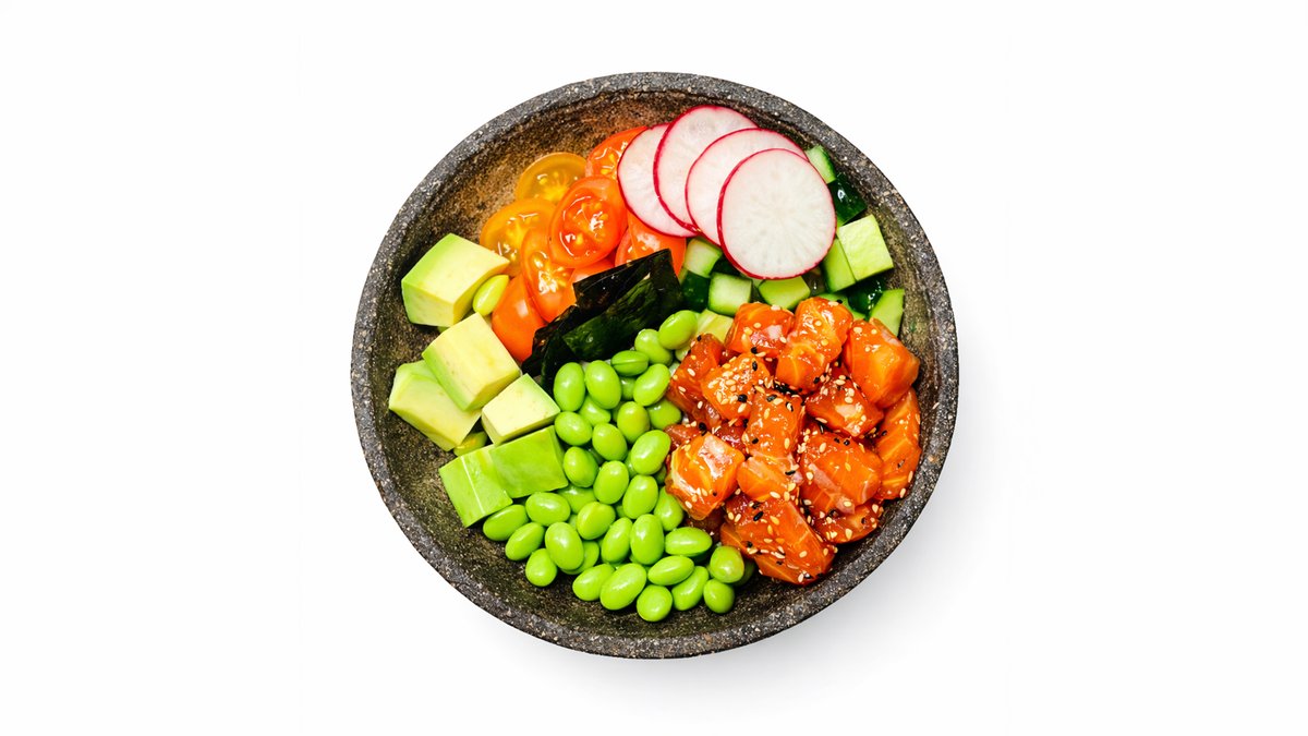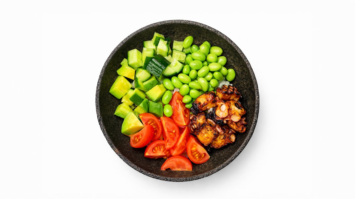 orez pentru sushi 0,2, avocado 0,03, roșii cherry 0,03, castraveți 0,03, edamame 0,03, ridiche 0,015, caracatiță 0,06, pastă miso 0,005, miere 0,002, ulei 0,001, susan 0,003, sos yuzu ponzu 0,03 Valori nutriționale per 100 g Calorii: 168 kcal Energie: 703 kJ Proteine: 6,5 g Grăsimi: 4,8 g Carbohidrați: 24,1 g Alergeni moluște, soia, gluten, susan