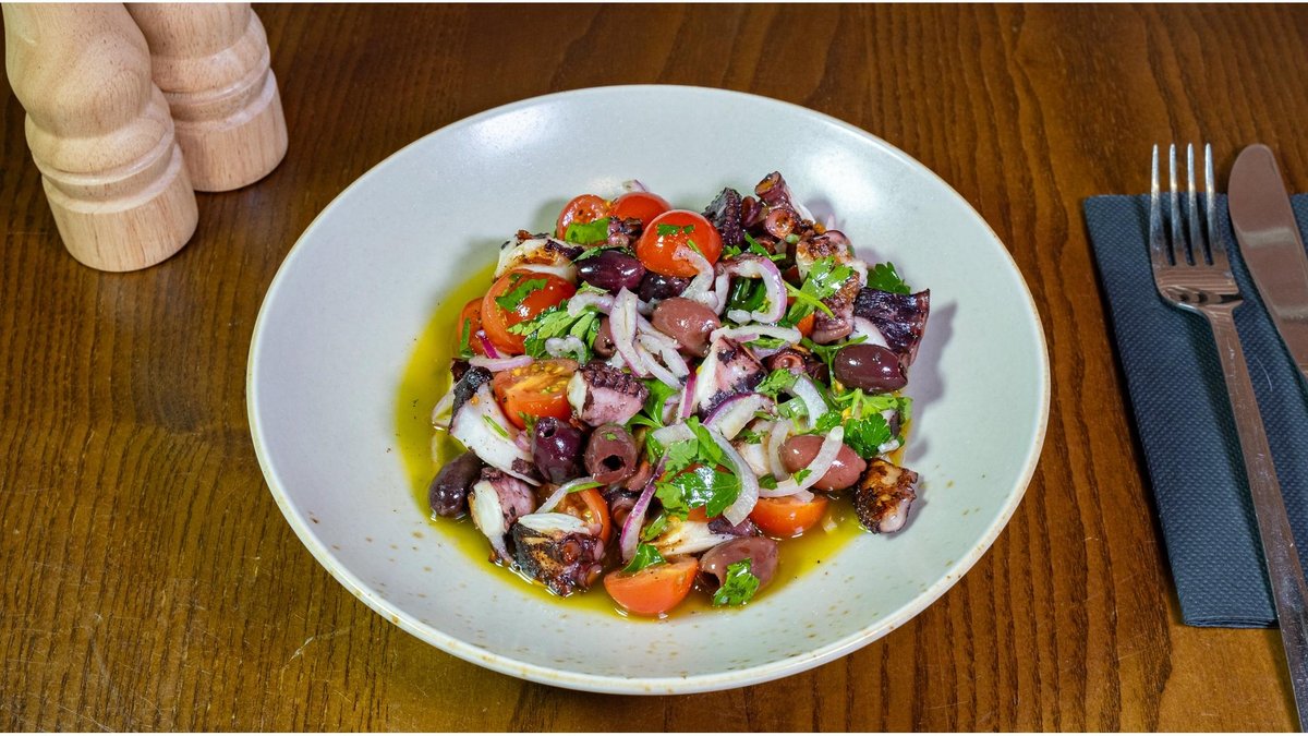 Caracatiță, măsline, ulei măsline, oțet, roșii cherry, ceapă, 300g