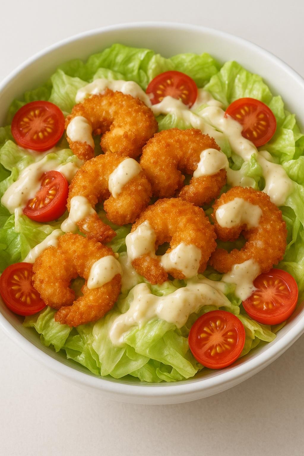 Valori nutriționale per 100 g per porție (320 g) Valoare energetică 188 kcal / 785 kJ 602 kcal / 2510 kJ Grăsimi 11,7 g 37,4 g – din care acizi grași saturați 1,9 g 6,1 g Carbohidrați 8,1 g 26 g – din care zaharuri 3,6 g 11,5 g Fibre 1,1 g 3,5 g Proteine 10,2 g 32,6 g Sare (Na x 2.5) 1,05 g 3,36 g Colesterol 105 mg 336 mg Ingrediente principale: Salată iceberg (31%), creveți pane (38%) [creveți, pesmet panko, ou, făină, ulei pentru prăjit], roșii cherry (16%), maioneză (9%) [ulei vegetal, ou, muștar, lămâie], sos dulce-acrișor (6%) [zahăr, oțet, sos de roșii, condimente].