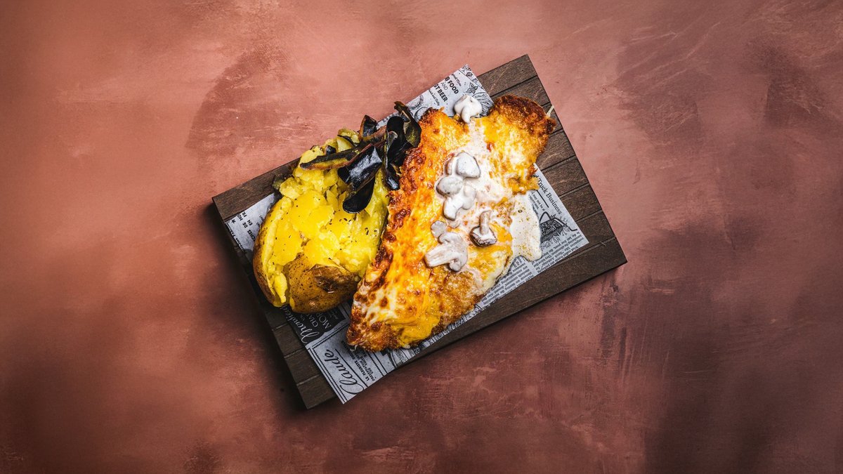 Piept de pui, pesmet panko, mozzarella, cheddar, bluechesse, branza Grana Padano, cartofi la cuptor, cimbrisor, usturoi - 300g / 200g