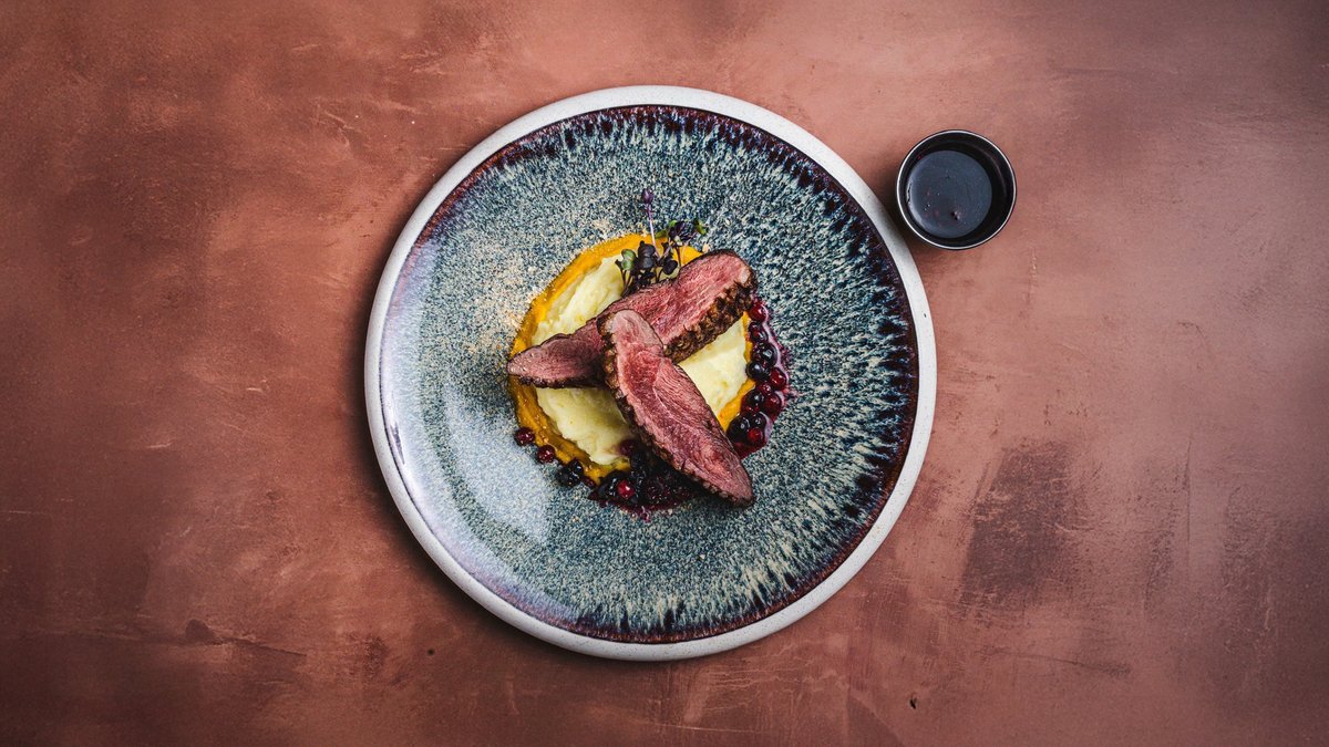 Piept de rata, piure fin de cartofi, reductie de fructe de padure - 250g / 200g / 30ml
