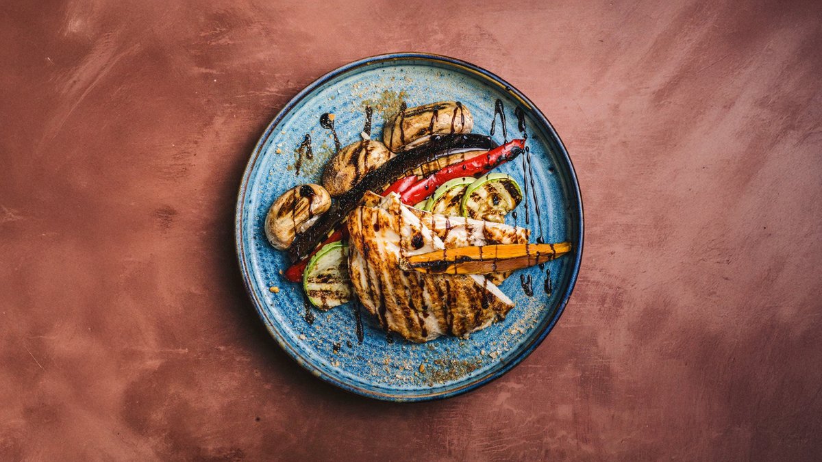 Piept de pui a la plancha, vinete, ciuperci, ceapa rosie, dovlecel, rosii cherry, reductie otet balsamic - 200g / 200g