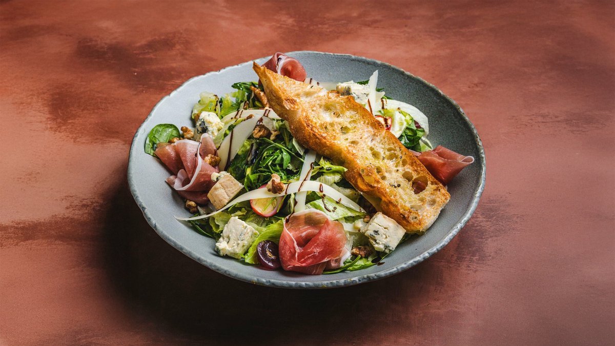 Prosciutto crudo, cruton focaccia, nuci, struguri, mere verzi, branză bluechesse, oua de prepeliță, salata mix de sezon, reductie de rodie - 350g / 100g