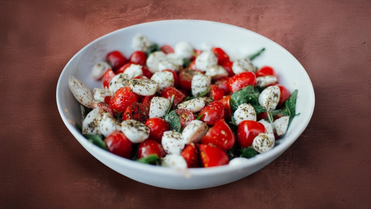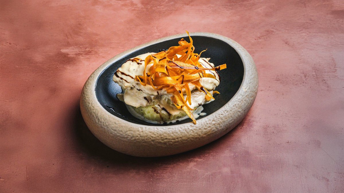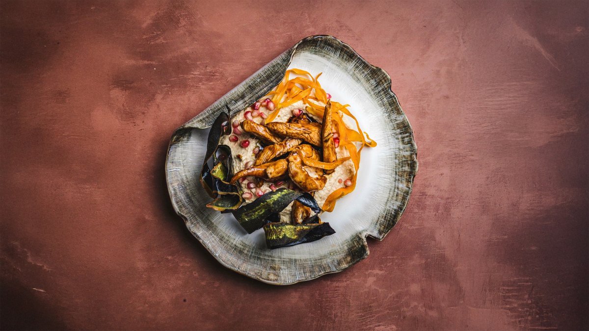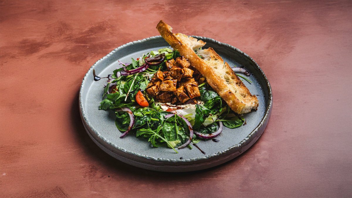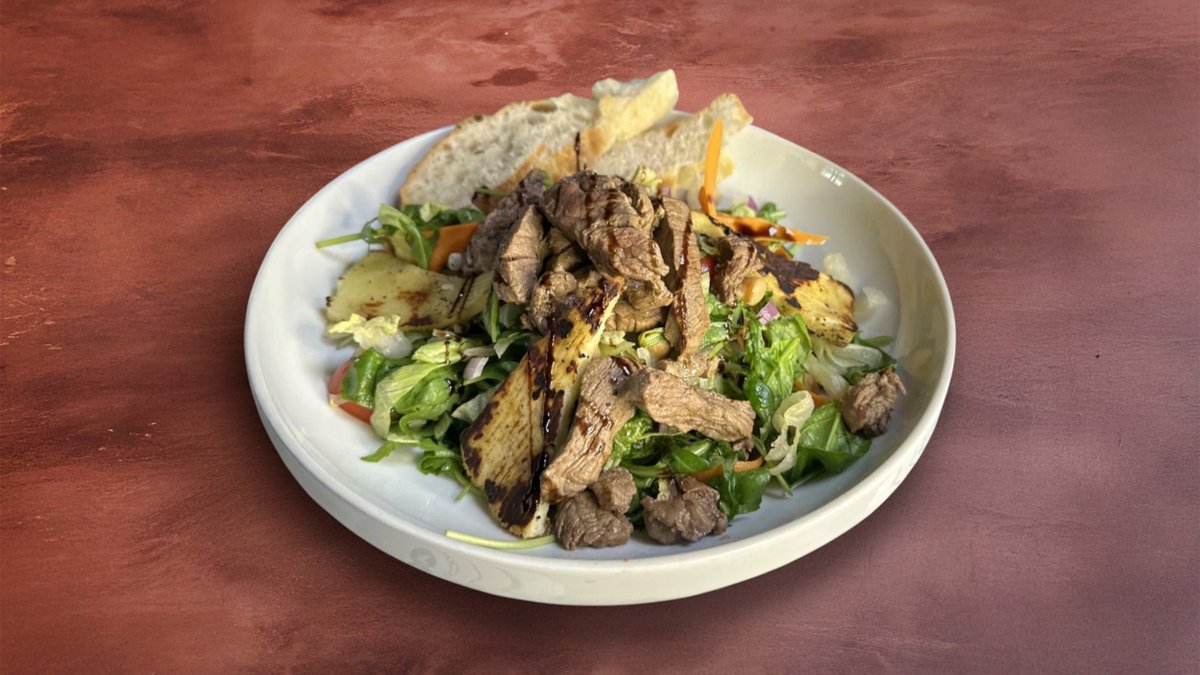 Muschi de vita, cruton focaccia, halloumi, rosii cherry, ceapa rosie, tagliatelle de morcov, seminte de rodie, naut caramelizat, crema de otet balsamic, dressing de citrice - 350g / 100g