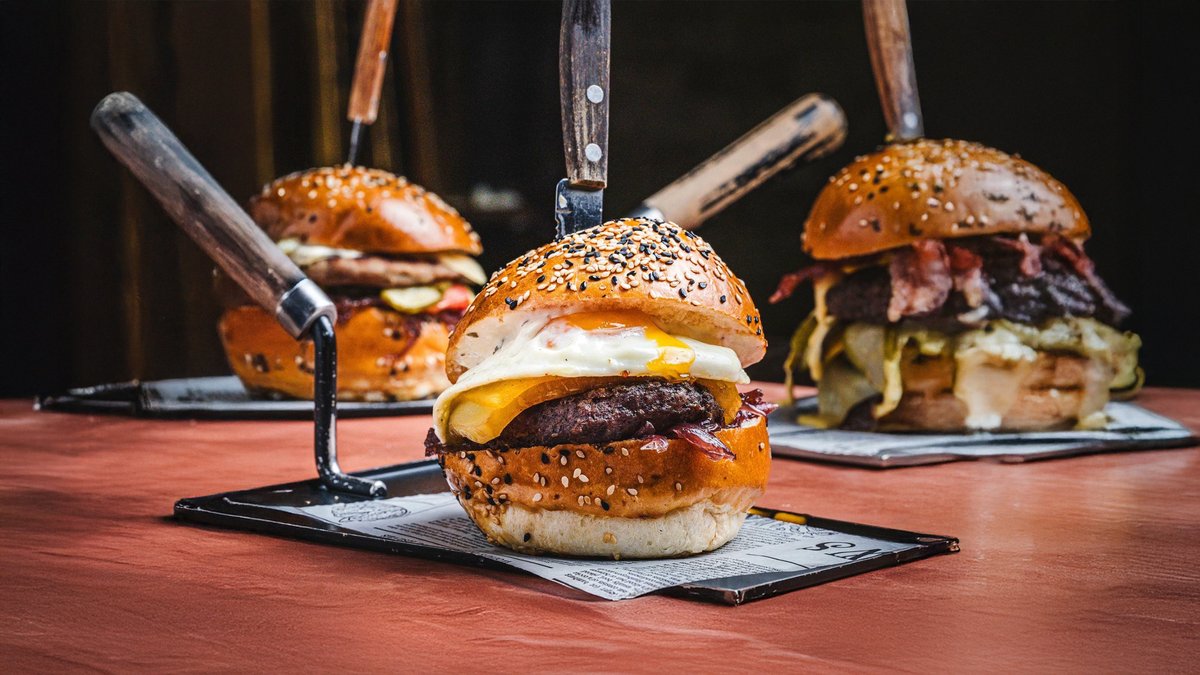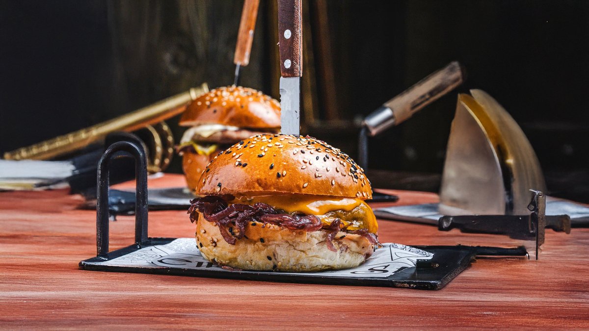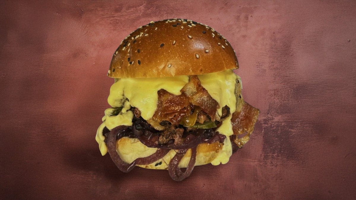 Chifla briosa cu seminte coapte, 3 palina de vita Black Angus, bacon crocant, ceapa caramelizata, cheddar, emmentaler cheese, castraveti murati, sos cheddar - 400g