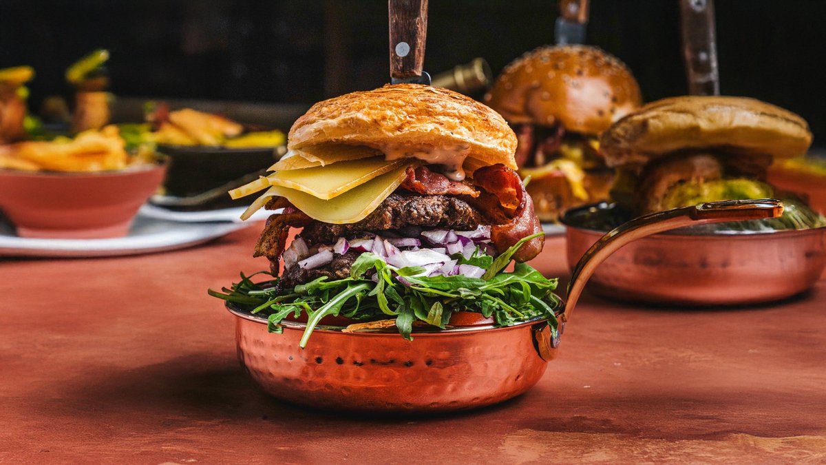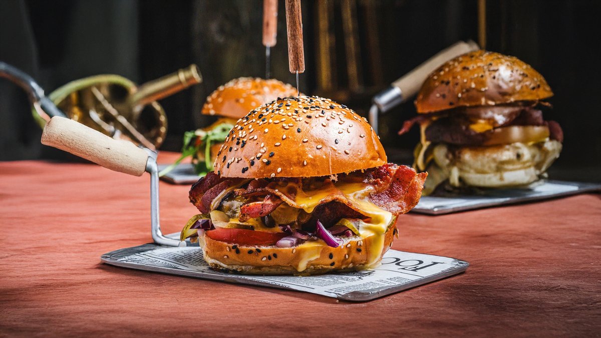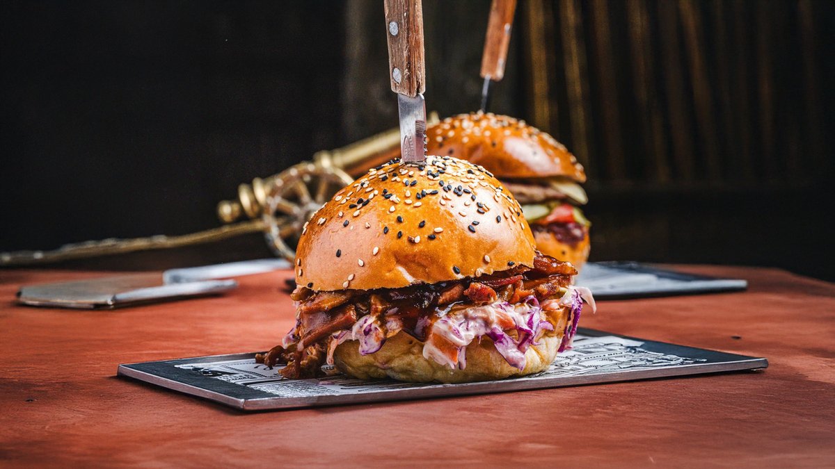 Chifla croissant cu unt, 2 palina de vita Black Angus, bacon crocant, cascaval afumat, rosii, ceapa rosie, rucola, sos tartar - 300g