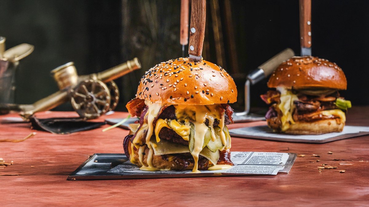 Chifla briosa cu seminte coapte, 2 palina de vita Black Angus, pepperoni crocant, cheddar, ou, castraveti murati, sos cheddar - 350g
