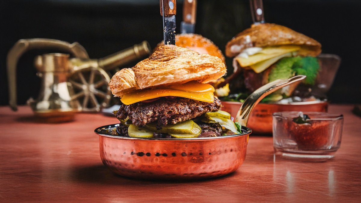 Chifla croissant cu unt, 2 palina de vita Black Angus, pepperoni crocant, cheddar, ceapa caramelizata, castraveti murati, sos samurai - 300g