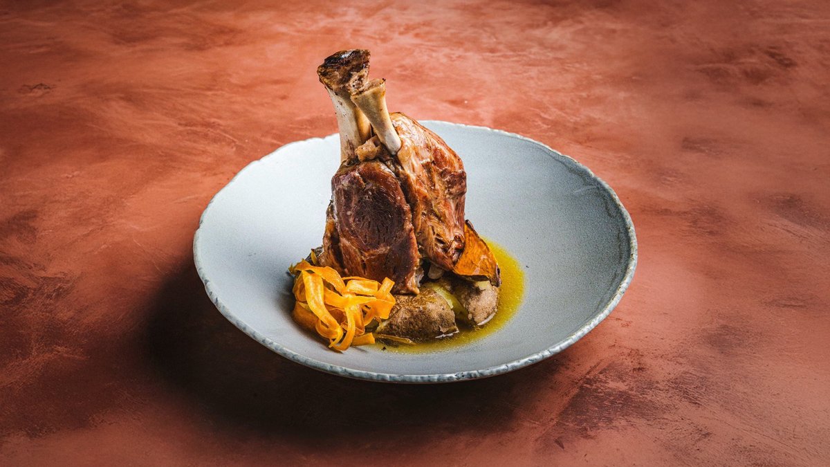Ciolan de porc gatit sous vide si usor afumat, cartofi la cuptor, cimbrisor, usturoi, sos de hrean - 650g / 200g / 50g