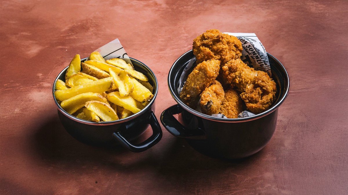 Aripioare de pui, branza Grana Padano, cartofi dippers, sos aioli - 300g / 150g / 50g