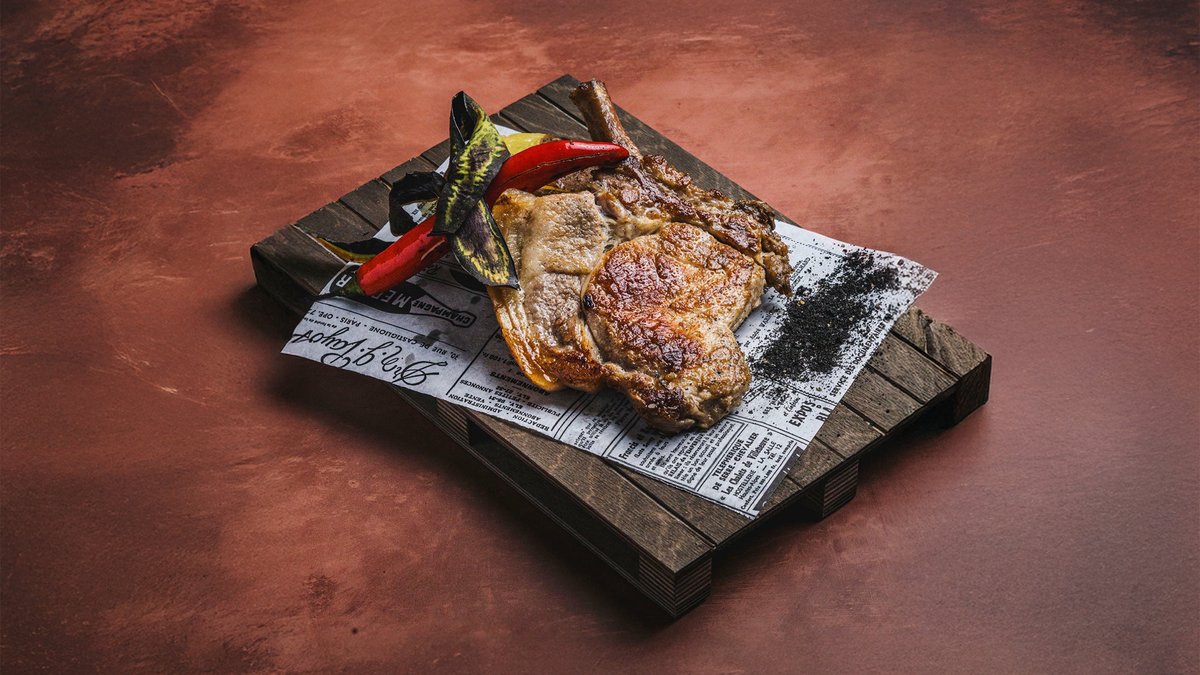 Cotlet de porc cu os, cartofi la cuptor, cimbrisor, usturoi, sos aioli - 450g / 150g / 50g