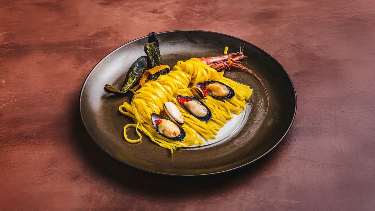 Pasta taglitelle, unt, creveti Black Tiger, midii, tentacule de calamarin sos rose cu busuioc fresh si verdeata proaspăta - 350g