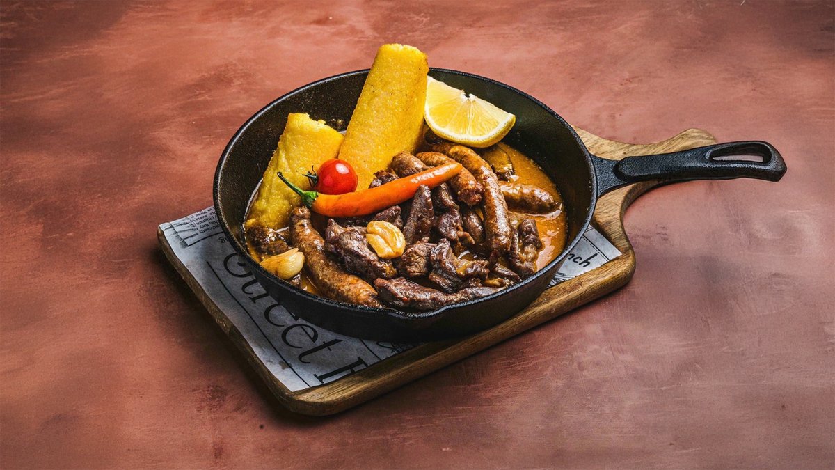 Ceafa de porc, carnati proaspeti de porc usor picanti, usturoi, vin alb demisec, mamaliga prajita, salata de varza murata - 250g / 200g / 100g