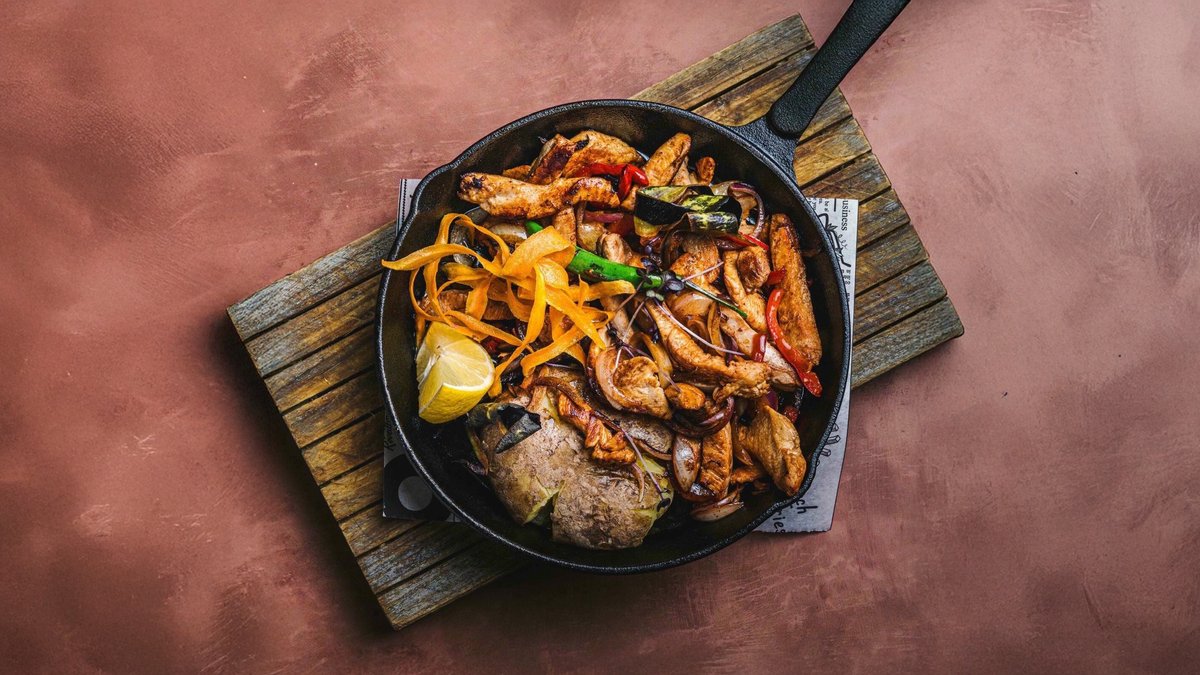 Ceafa de porc, piept de pui, ardei gras, ciuperci, ceapa rosie, ardei iute, verdeturi din plin, vin alb demisec, cartofi la cuptor, cimbrisor, usturoi - 300g / 200g