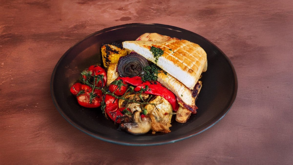 Piept de curcan a la placha, rosii cherry, vinete, dovlecei, ciuperci, ardei capia, sos pesto verde - 200g / 250g / 50g