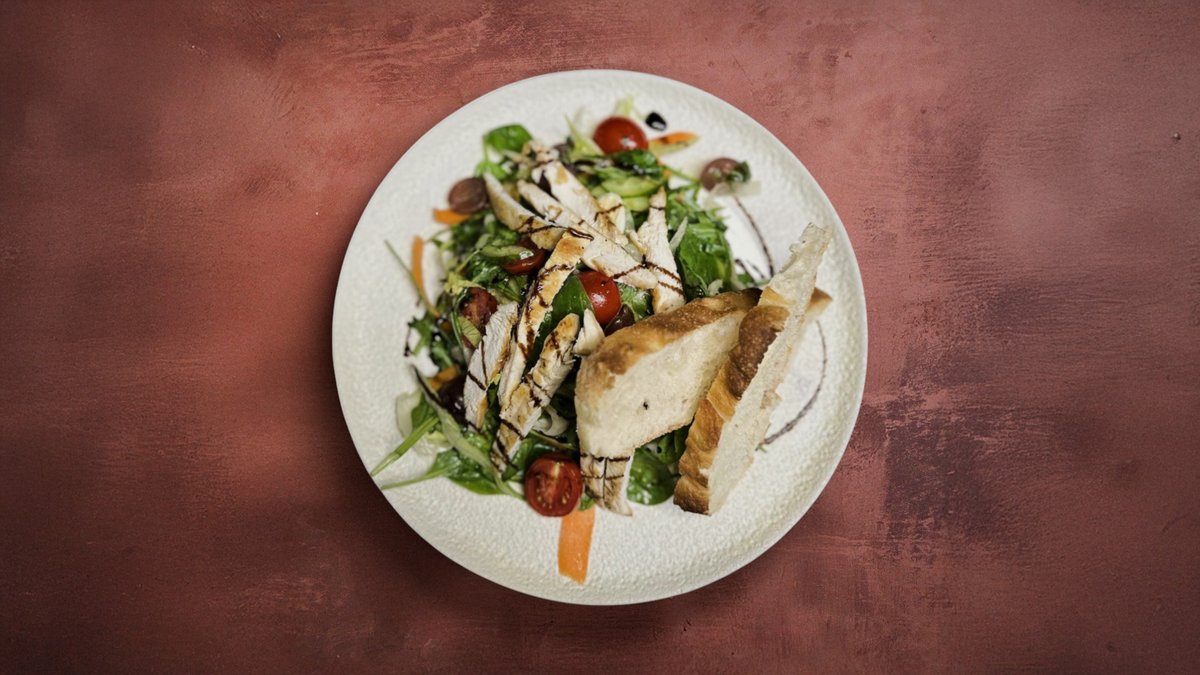 Piept de pui, cruton focaccia, rosii cherry, oua de prepeliță, tagliatelle de morcovi, castraveti verzi, struguri, salata mix de sezon, crema de otet balsamic, dressing de citrice - 350g / 100g