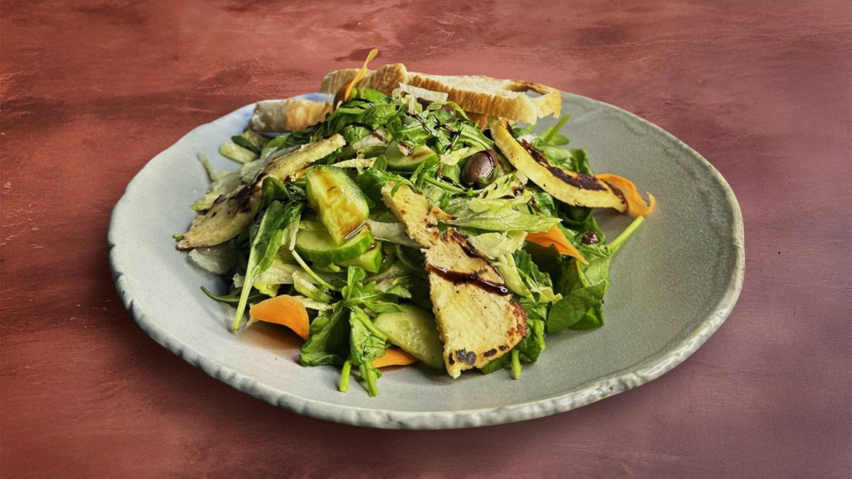 Branza halloumi la gratar, cruton focaccia, castraveti verzi, salata mix de sezon, masline kalamata, tagliatelle de morcov, dressing fresh - 350g / 100g
