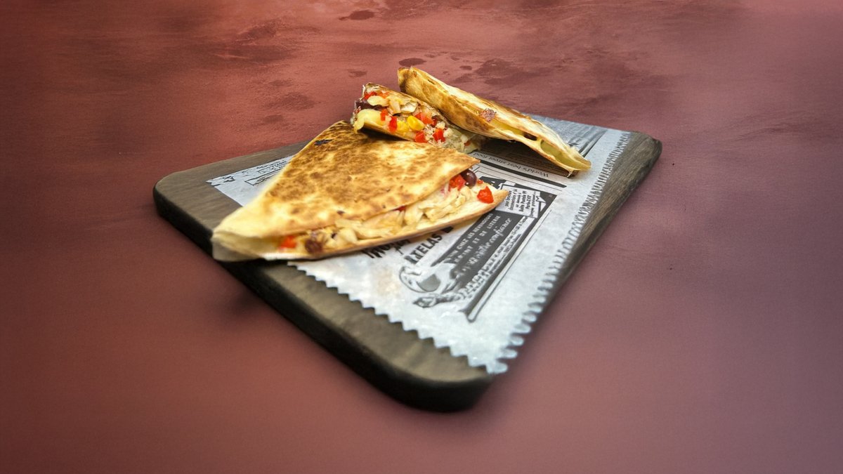 Tortilla gatita pe plita, carne de pui, fasole rosie, porumb dulce, ceapa rosie, mozzarella, cheddar, cartofi dippers - 250g / 150g