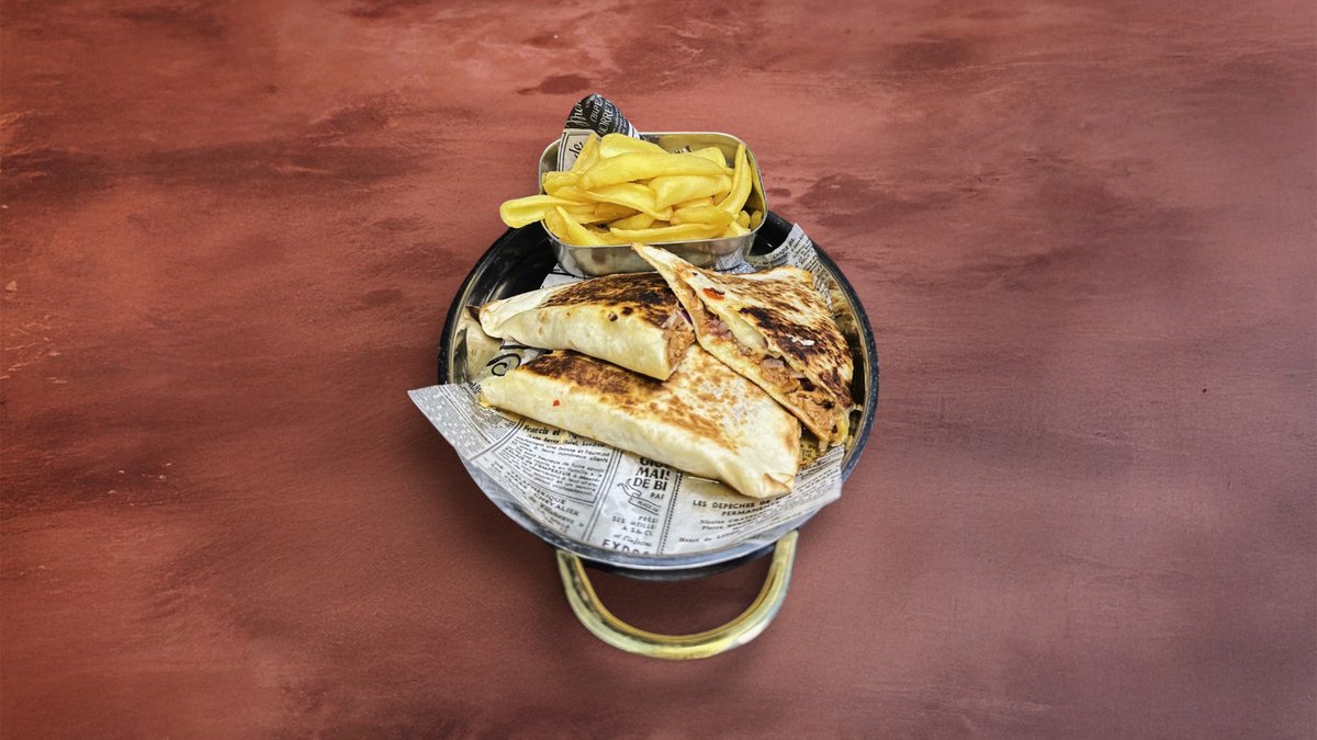 Tortilla gatita pe plita, carne de vita tocata, fasole rosie, porumb dulce, ceapa rosie, mozzarella, cheddar, cartofi dippers - 250g / 150g