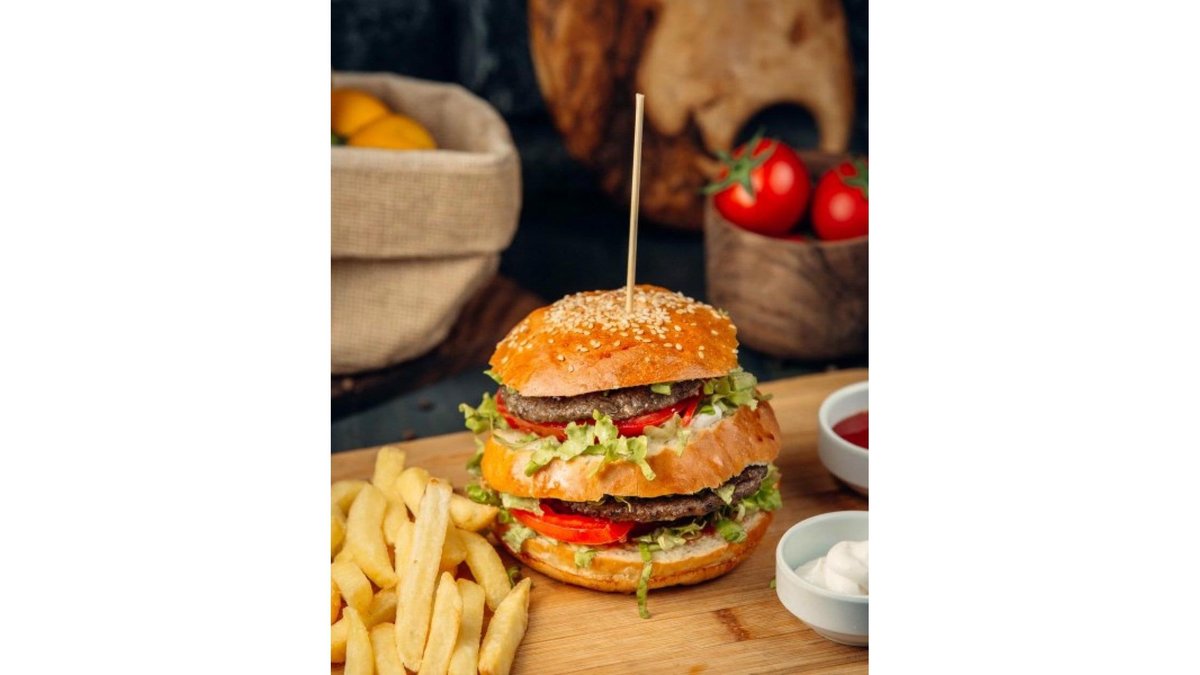 Ketchup, salată verde, 2 carne de vită, 2 brânză cedar, 2 bacon, ceapă caramelizată, sos burger, roșii, castraveți murați, sos burger