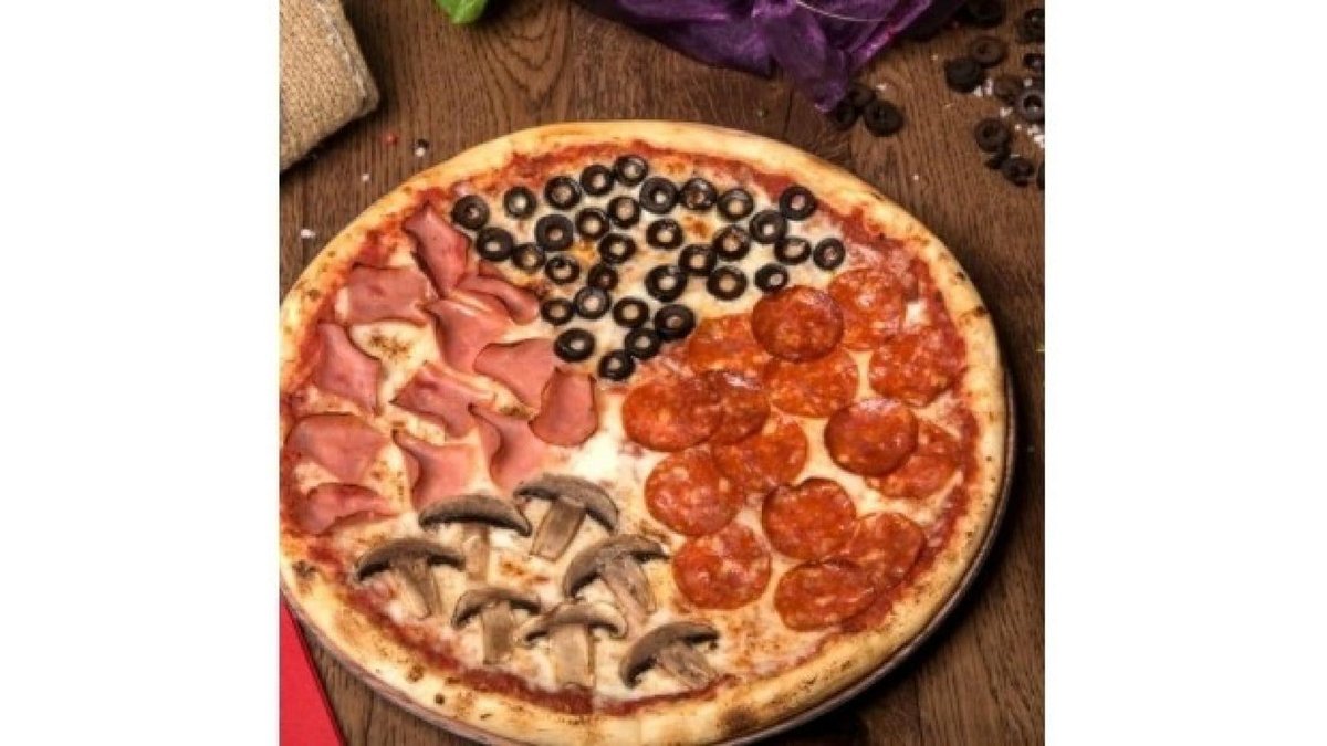 Sos de roșii, mozzarella, șuncă, ciuperci, măsline, ardei gras
